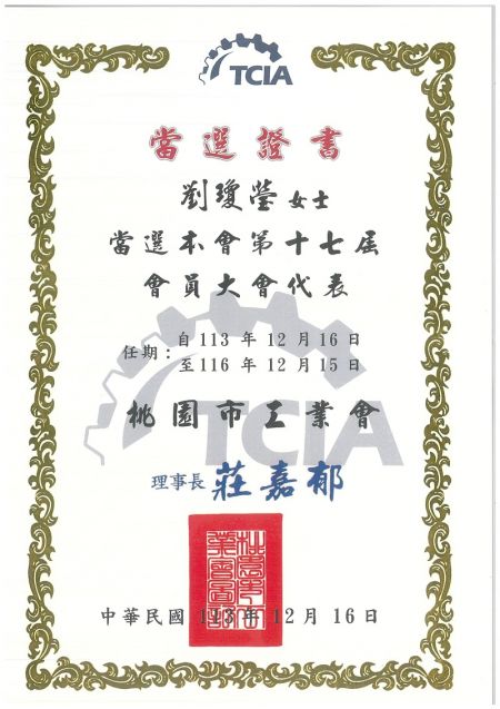 Yenchen Gerente Geral Liu Eleita como a 17ª Representante e Diretora da Associação Industrial da Cidade de Taoyuan
