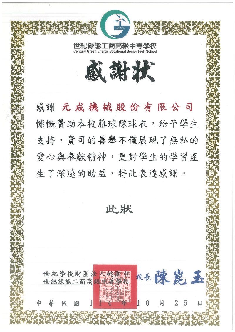 YENCHEN MACHINERY recentemente fez uma doação para a Escola Técnica de Ensino Médio Century Green Energy para apoiar a produção de uniformes para a equipe de sepak takraw da escola. Através desta iniciativa, Yenchen incentiva os alunos a participarem ativamente de esportes, promovendo oportunidades de aprendizado diversificadas e um desenvolvimento saudável. A escola expressou sua sincera gratidão a YENCHEN MACHINERY apresentando um Certificado de Agradecimento.